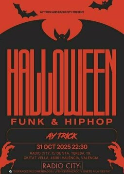 Ay Trick es tu nueva banda favorita de Funk & Hip Hop, tras una meteórica Tras su último «sold out», tenemos de nuevo a Ay Trick en Radio City, que nos brindará una fiesta de Halloween el próximo 31 de octubre que promete ser lo mejor que te puedas encontrar en la ciudad. Vístete con tu disfraz favorito y disfruta de los sonidos untrabailables de Ay Trick en RADIO CITY VLC.